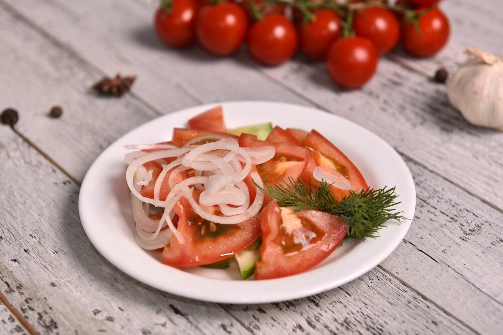 Ачик-чучук — освежающий салат из сочных томатов, ароматного лука и зелени с добавлением базилика и соли. Идеальный выбор для лёгкого и вкусного дополнения к вашему блюду