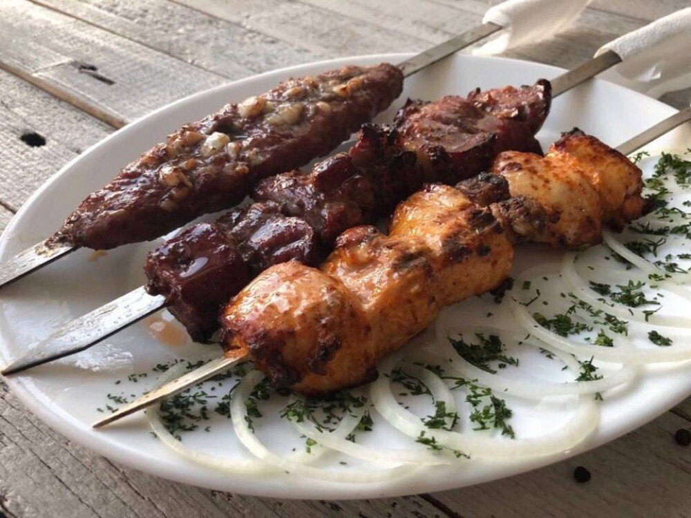 Нежный и сочный шашлык, приготовленный из говядины. Подаётся с пикантным маринованным луком, который подчёркивает вкус мяса